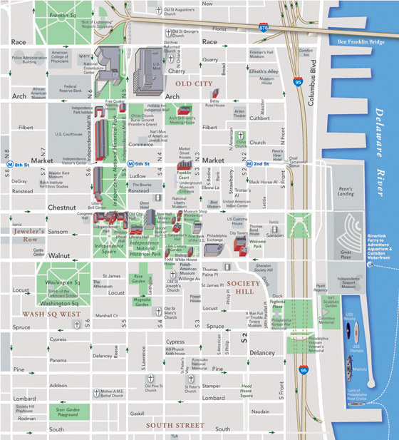Inset detail of the Old City Section of Philadelphia, part off a comprehensive tourist brochure to attract visitors to this historic city. |